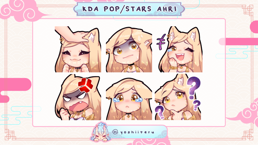 Emotes, 6pcs: KDA P/S Ahri Headpat; KDA P/S Ahri Sweat; KDA P/S Ahri Laugh; KDA P/S Ahri Angry; KDA P/S Ahri Cry; KDA P/S Ahri Confused
