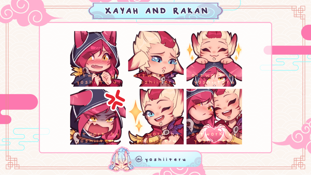 Emotes 6pcs: Xayah ''Blush''; Xayah ''Angry''; Rakan ''Cry''; Rakan ''Wink''; X&R ''Sparkle''; X&R ''Heart''
