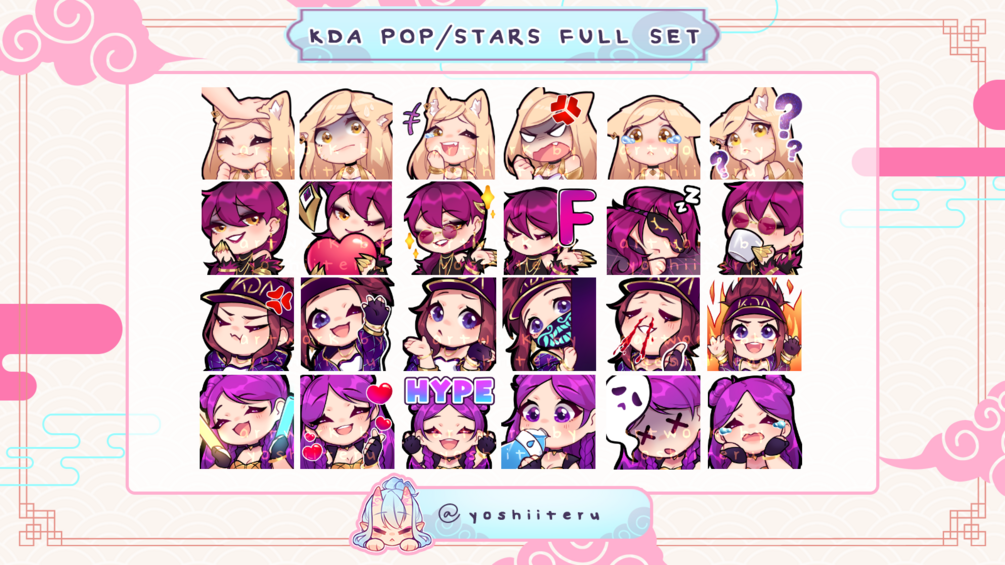 A full set of emotes featuring Ahri, Evelynn, Akali, and Kai'Sa with their KDA POP/STARS skin designs, suitable for Twitch and Discord.