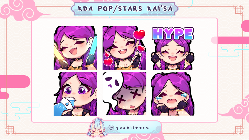 A set of Kai'Sa emotes with her KDA POP/STARS skin design, suitable for Twitch and Discord.
