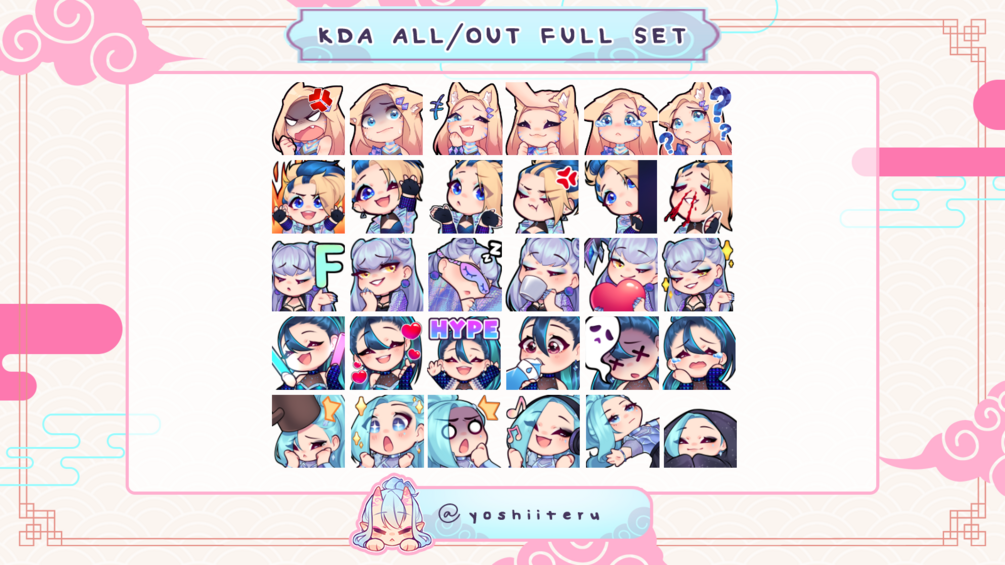 A full set of emotes featuring Ahri, Evelynn, Akali, Kai'Sa and Seraphine with their KDA ALL OUT skin designs, suitable for Twitch and Discord.